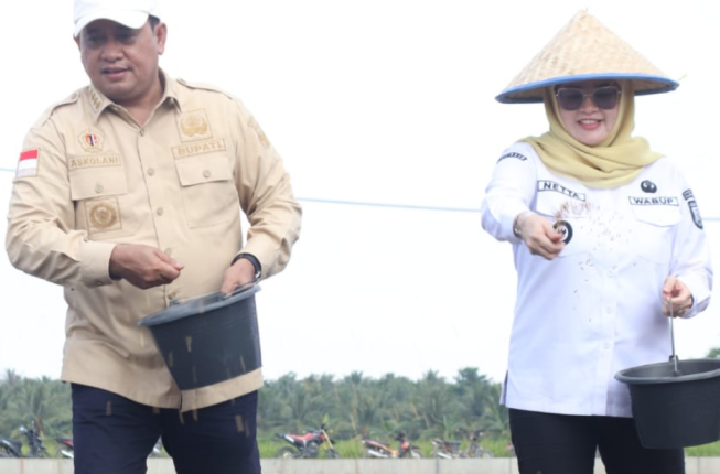 Lentera-PENDIDIKAN.com,BANYUASIN-Bupati Banyuasin, Dr. H. Askolani, SH., MH dan Wakil Bupati Banyuasin, Netta Indian, SP bersama Kapolres Banyuasin, AKBP. Ruri Prastowo SH SIK MIK melakukan Tabur Benih IP 300 perdana di Kabupaten Banyuasin di Desa Mekar Sari Kecamatan Karang Agung Ilir, Jum’at (25/07/2025).