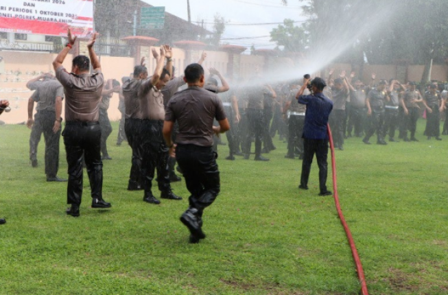 Tradisi penyiraman air ini dipimpin langsung oleh Kapolres Muara Enim AKBP Jhoni Eka Putra, S.H., S.I.K., M.Si., sebagai bentuk ucapan selamat sekaligus simbol penyucian diri bagi personel yang menerima pangkat setingkat lebih tinggi.