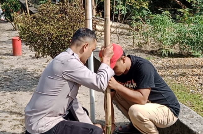 Bhabinkamtibmas Desa Muara Harapan, Aiptu Veri E. Atmojo, bersama warga setempat bergotong-royong memasang bendera merah putih di pinggir jalan depan rumah warga.