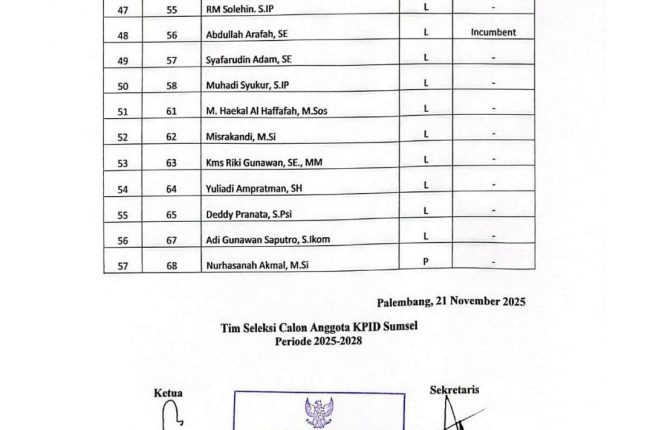 Lentera-PENDIDIKAN.com,PALEMBANG-Pada tahapan Seleksi Administrasi Calon Anggota KPID Sumatera Selatan Periode 2025–2028, sebanyak 68 peserta terdaftar dan mengikuti pemeriksaan kelengkapan berkas.